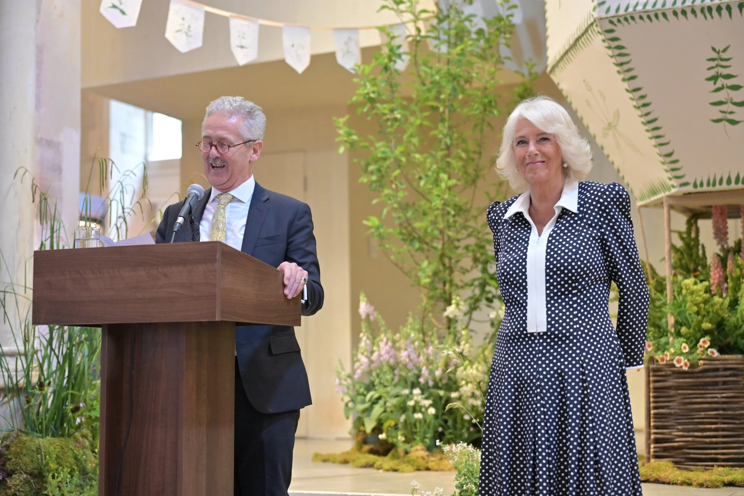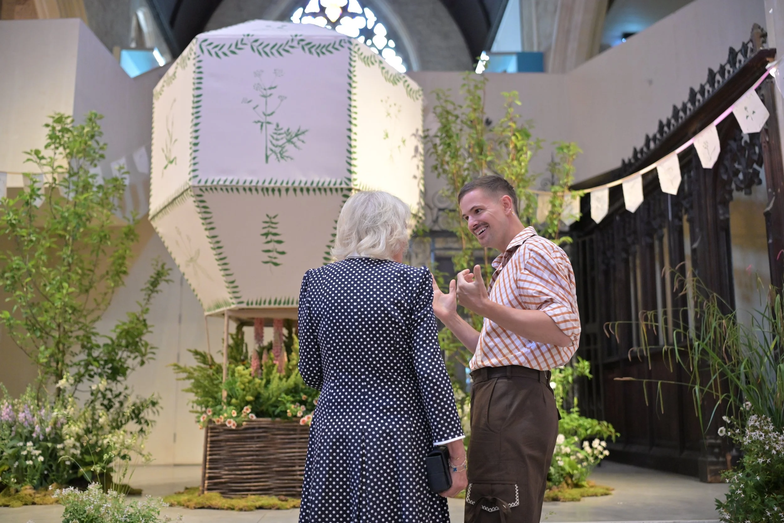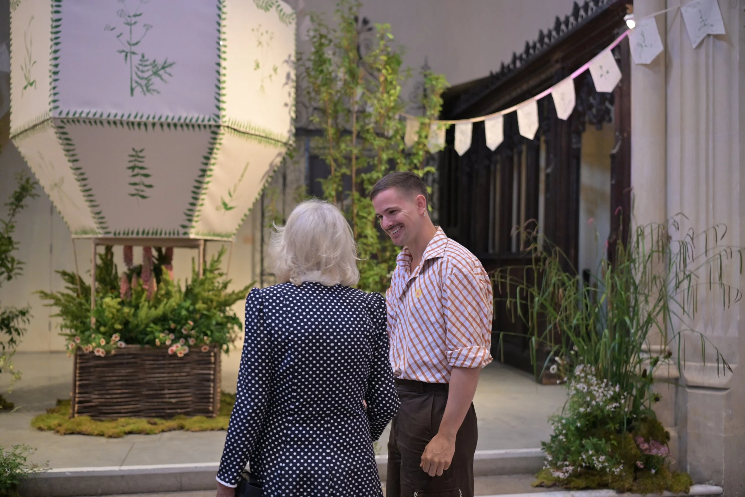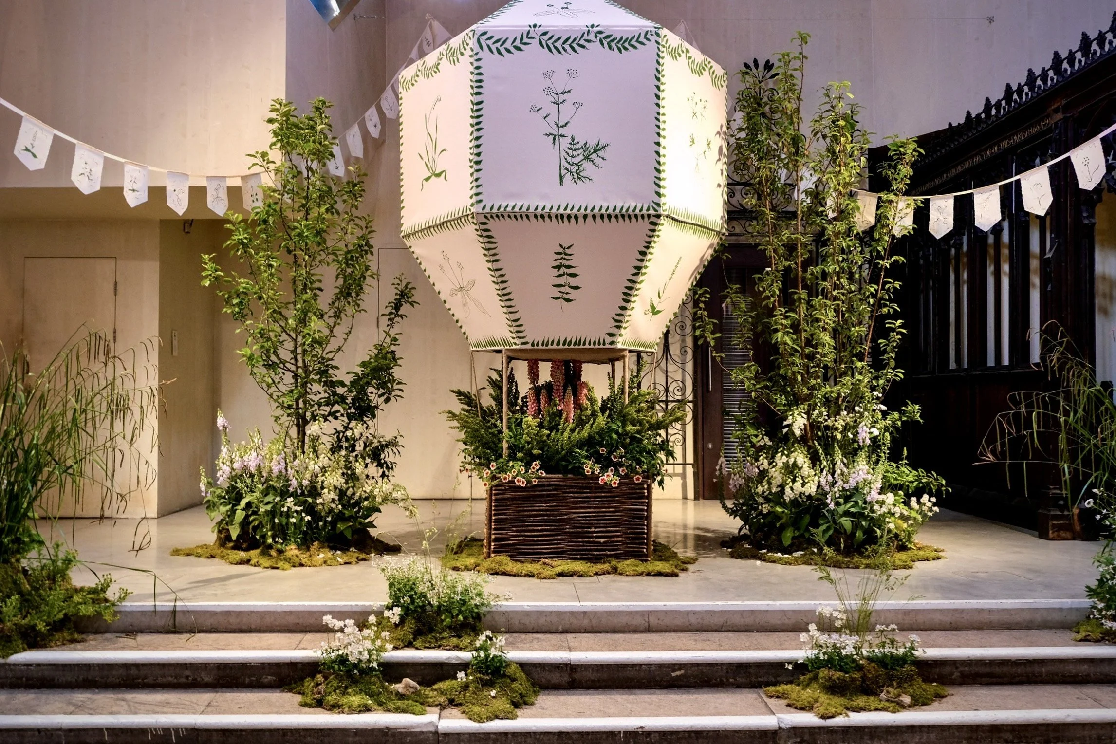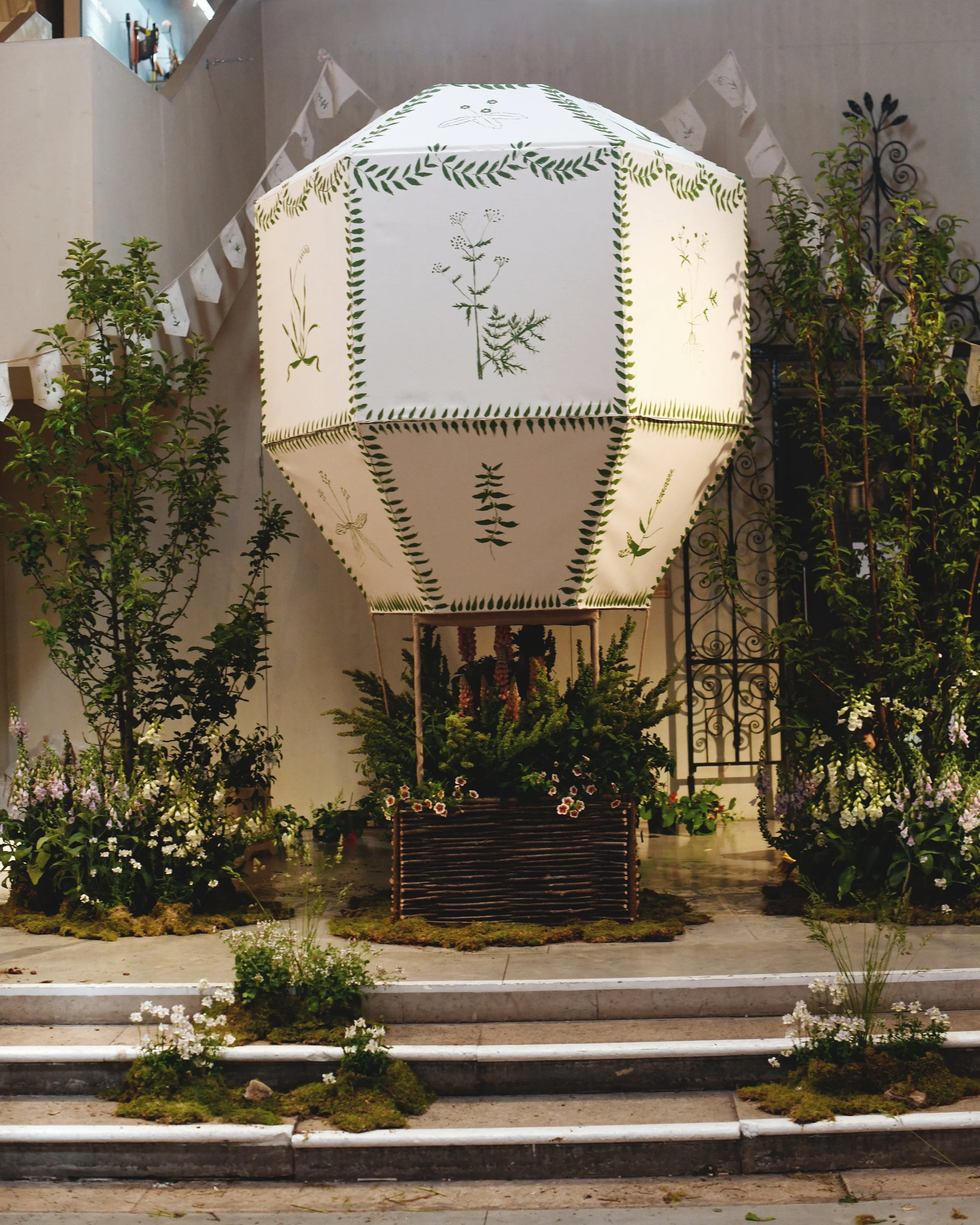 For British Flowers Week 2025 at the Garden Museum, I had the great honour of being given the stage to create an installation on the theme of Cecil Beaton’s Garden Party. To pay homage to his vast array of limitless creative talents, I created a large painted hot-air balloon, as if lifting off, up, up and away, above the magnificent cloud topiary at Reddish House, his beloved Wiltshire home. Soaring on the fiery hues of lupins, set within in a tranquil meadow of foxgloves and white flowers to reflect the tranquility of the water meadow at Reddish.